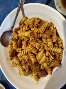 そして今回もお店の方のご厚意でお肉入りカレーパスタと甘くて冷たいクッキー付バニラアイスをご馳走になりました。
