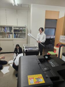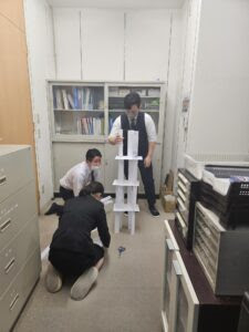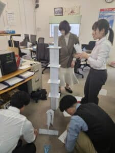 3チームに分かれて、制限時間内に紙をできるだけ高く積み上げ